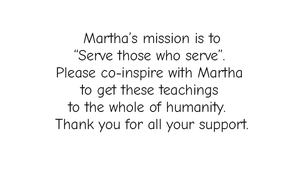 Martha goes to whatever extent, in her realm of possibilities, to cut thru the false belief systems that are holding any of us back from our own internal, divinely appointed freedom and she does this with the ease, grace and unconceivable love."